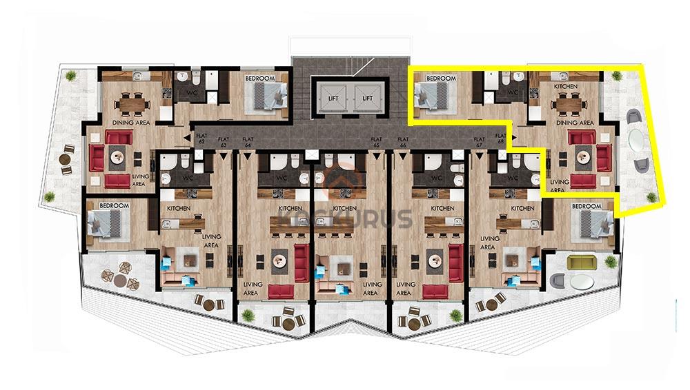 Our apartment for sale is located on the 10th floor, with a 1+1 layout and a total size of 78 m2. It features a spacious balcony with stunning Mediterranean views and is just 550 meters from the Long Beach coast.