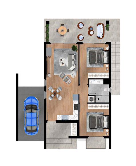 - تراس با پرگولا نیمه باز در طبقه همکف