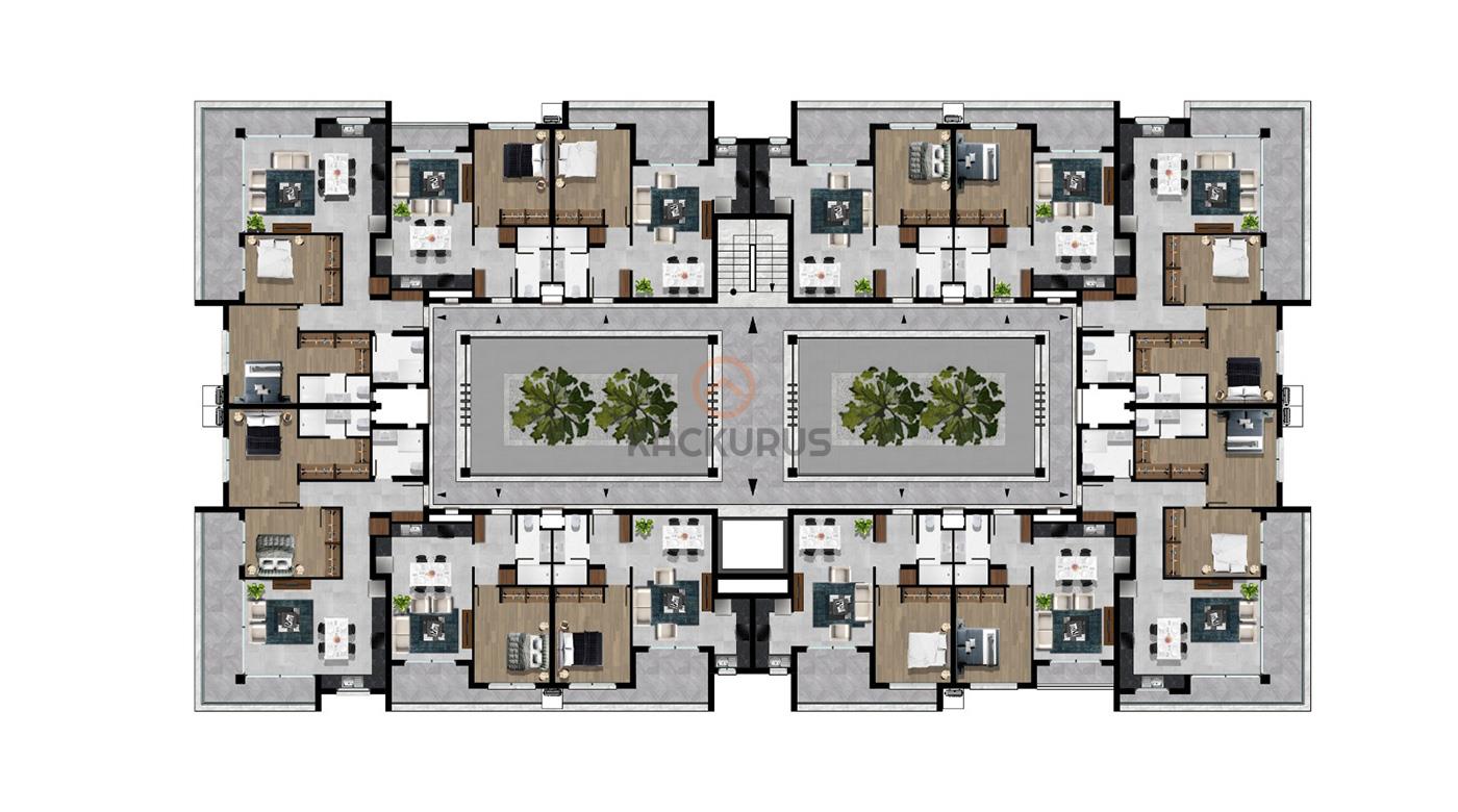 - 5. Kat: 4 daire (2+1) + 4 daire (1+1) – özel çatı teraslı