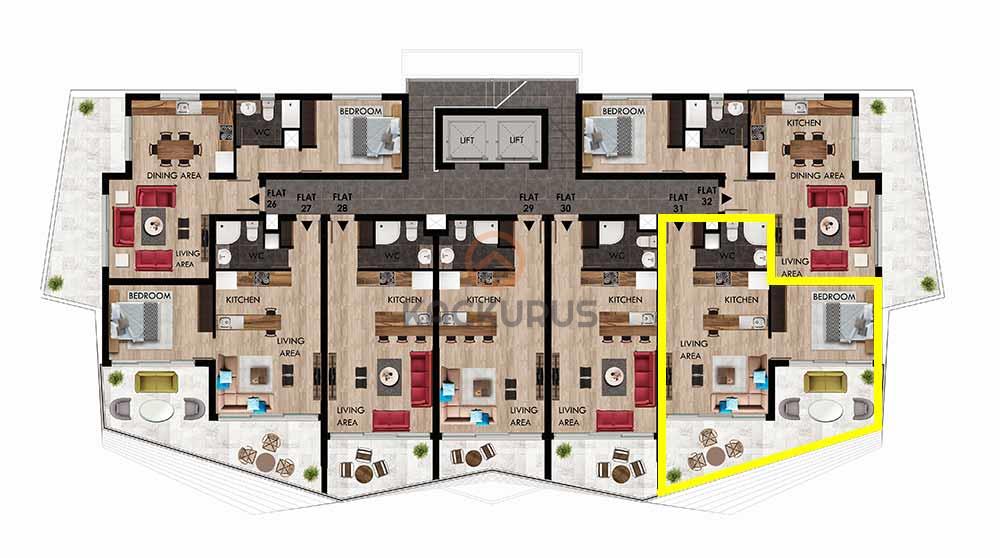 Özel mimarisi ve her daireden eşsiz Akdeniz manzarasına hakim konumuyla dikkat çeken lüks site, 72.5m2 1+1 satılık daire, adanın en uzun ve popüler kıyısı Long Beach'e sadece 550 metre yürüyüş mesafesinde yer alıyor. Dairemiz 18.5m2 genişliğinde balkona sahiptir.