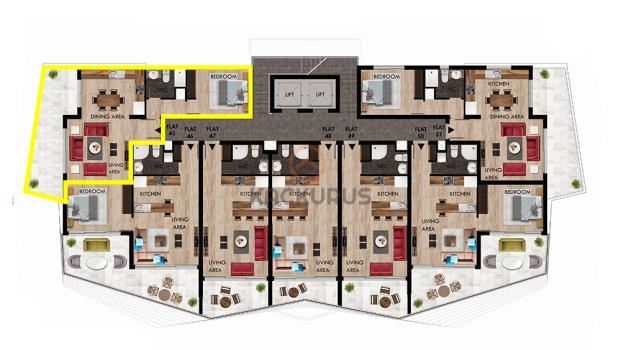 In der luxuriösen Wohnanlage, die mit der wunderschönen und berühmten Long Beach in İskele verschmilzt, sichern Sie sich jetzt Ihre 1+1 Wohnung mit 78m2 im 7. Stock.