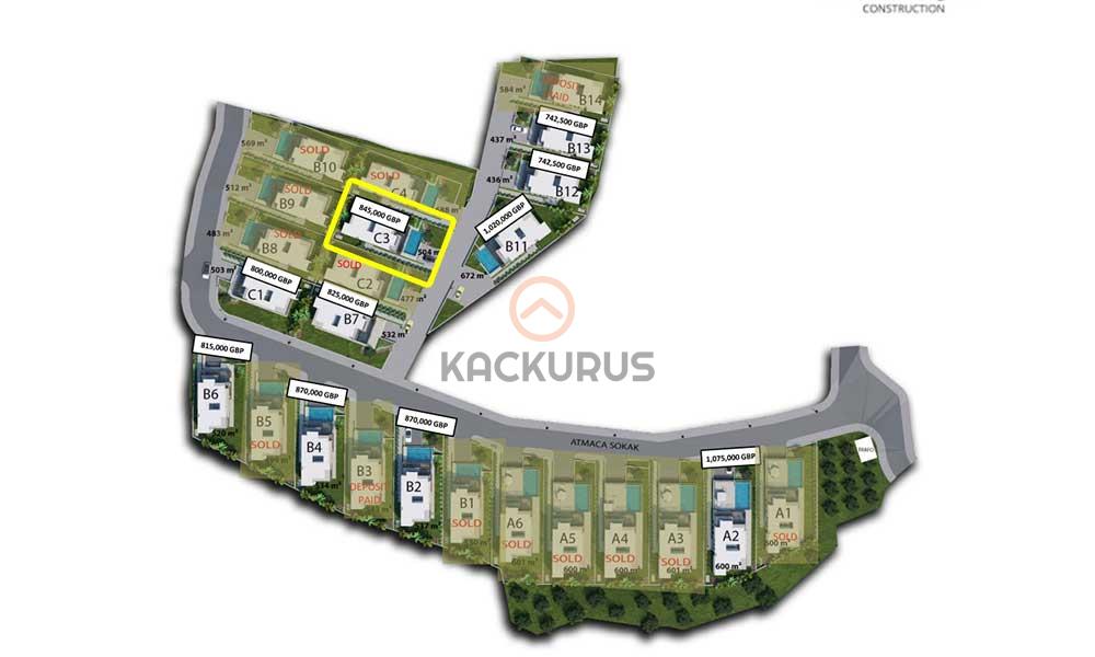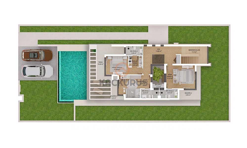 - فيلا من النوع C الفاخرة لدينا هي 4+1 وتحتوي على مسبح، وتبلغ مساحتها الإجمالية 246 مترًا مربعًا.